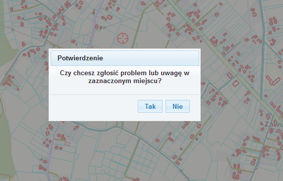 4. Po kliknięciu pojawia sie okienko komunikatu: 5. Pojawia się formularz do uzupełniania: 6. Uzupełniony wniosek przesyłamy do urzędu miejskiego klikając "wyślij zgłoszenie" By zrezygnować z wysłania wniosku, wystarczy kliknąć "Zrezygnuj ze zgłoszenia" 7. Po wysłaniu pojawi się okienko z komunikatem: 8. Widok zgłoszenia, które dotrze na skrzynkę pocztową urzędu miejskiego: Dziękujemy za skorzystanie z narzędzia Mapa Interaktywna |